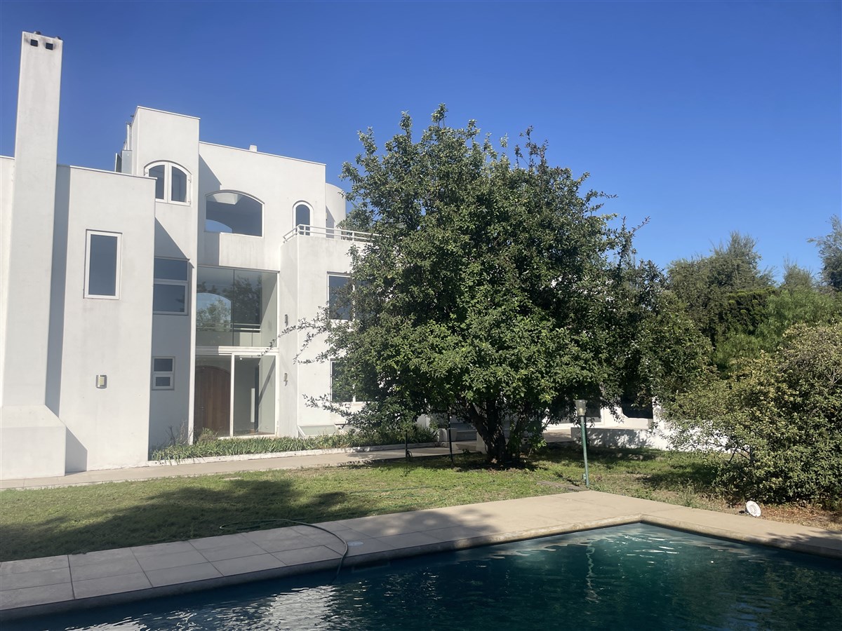 Jardín formado con gran piscina y quincho techado de 56 m2 con parrilla y horno de barro, cancha de pasto multiuso, sendero peatonal para recorrer cómodamente toda la propiedad.