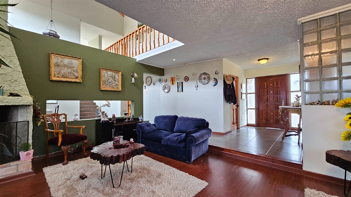 Living con chimenea y salida a terraza techada