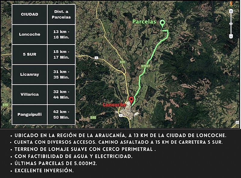 Aprovecha esta oportunidad única de adquirir una de las últimas parcelas de 5.000 m² en la Región de La Araucanía, a solo 15 km de Loncoche. Perfectas para disfrutar de la tranquilidad de la naturaleza y con excelente conectividad a destinos turísticos como Villarrica, Licanray y Panguipulli, a solo 30 minutos de distancia.